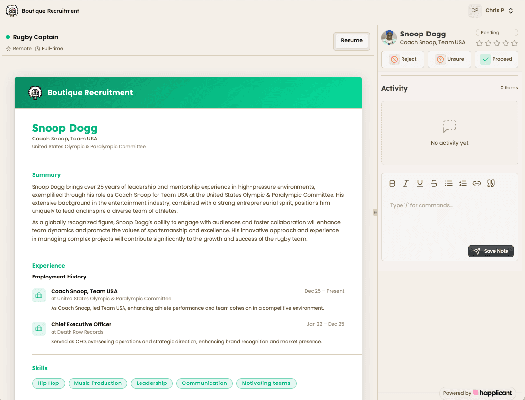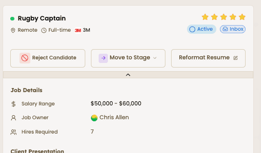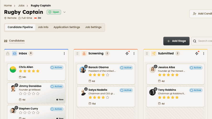 Rating candidates is also easy, just click the star icon on a candidate card to assign a rating. This can be edited anytime.