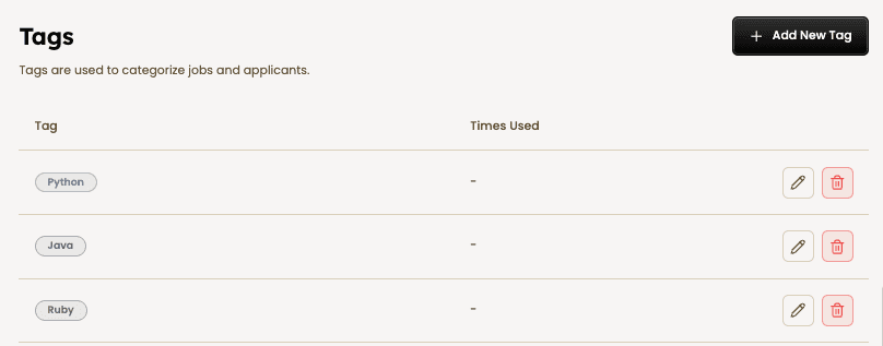 Tags are one of the best ways to search for candidates in your database. You can add, edit and delete custom tags from the Tags tab in settings. You can also create tags on candidate profile pages.
