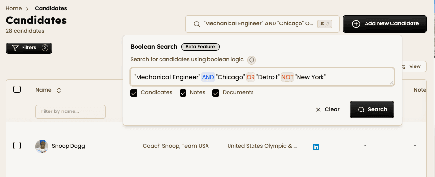 Use Boolean search to pinpoint the right candidates in seconds. Combine keywords with operators like AND, OR, and NOT to narrow, expand, or refine results across your entire candidate database.