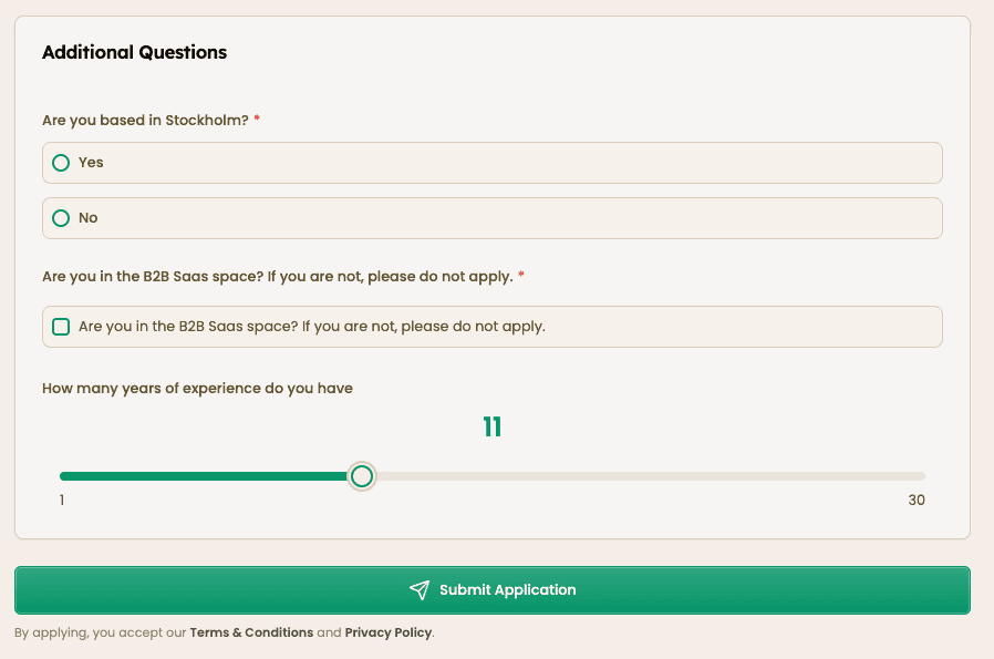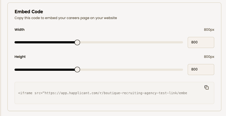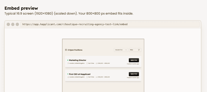 You can use Happlicant to easily embed all your open jobs on your website. This is perfect for when you want to showcase all open jobs on your website so anyone who wants to apply can very easily do so by clicking the Apply Now button.