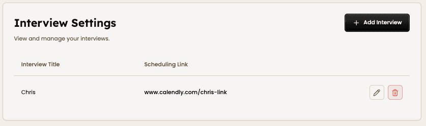 In the Interviews tab, you can set up interview scheduling links—for yourself, your team members, or your clients. Just click Add Interview, then enter the name and link.