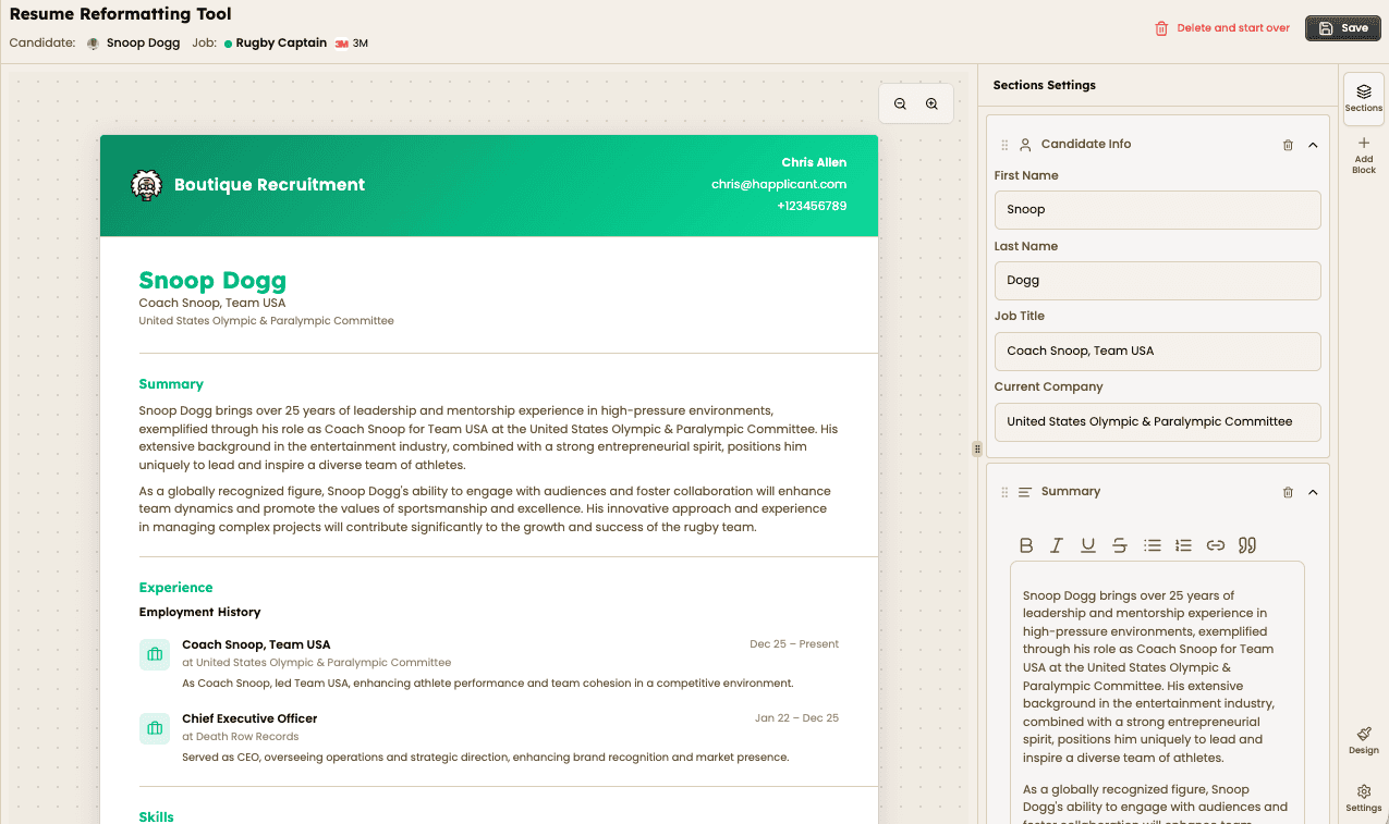 Taking the candidate profile, the job description, all your notes, the resume reformatting tool will automatically generate a branded resume for you to share with your client.
