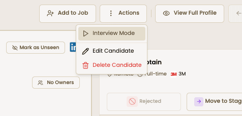 To make screening candidates easier, we created Interview Mode. Go to Actions in the top right-hand corner of the screen, and select "Interview Mode". You can switch between tabs (e.g., candidate info, resume, etc.) and see the critical information on your candidates, all while you take notes.