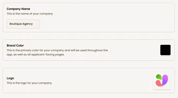 Head to the settings configuration page and in the "Company" tab add your: Company name, logo and main brand color. This color will be used across the platform, including in candidate-facing elements, like the application form and other components. You can use the exact Hex color by checking the checkbox.