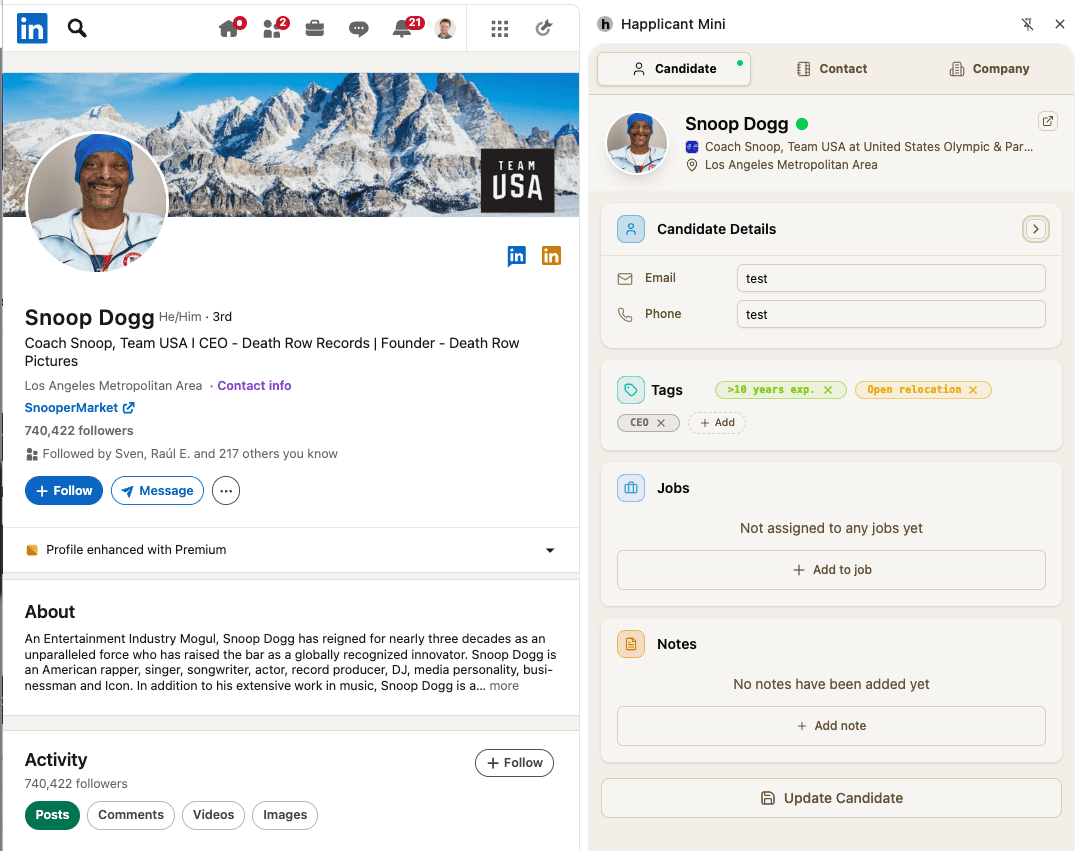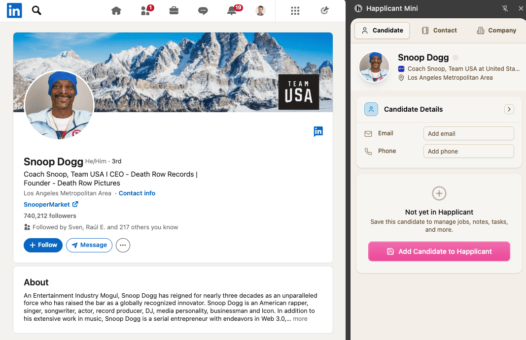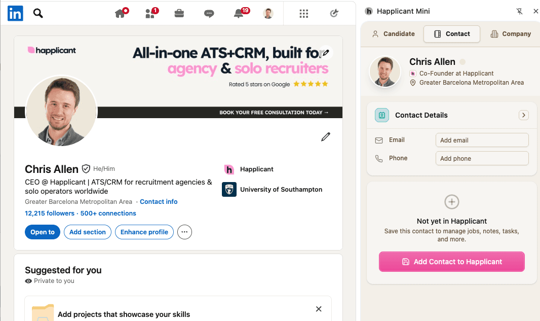 One of the easiest ways to get candidates into your database is to scrape their LinkedIn profile using Happlicant's LinkedIn Chrome extension.