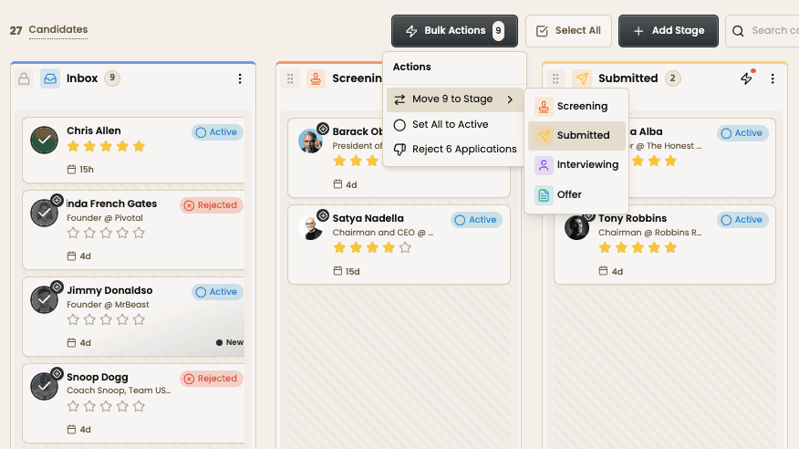You can also perform bulk actions by either selecting candidates individually, clicking their initials in the circle, or selecting all candidates in a stage by clicking the three dots in the top-right corner.