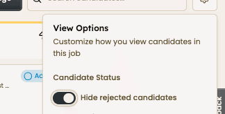 If you prefer a cleaner pipeline, you can hide rejected candidates by click the gear icon in Kanban and toggling on "Hide rejected applications".