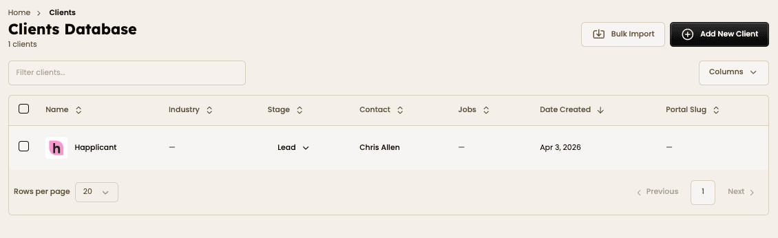 If you prefer, you can also add clients or leads manually by pressing the Add New Client button. You'll need to enter a Client Name to get started. All other fields are optional.