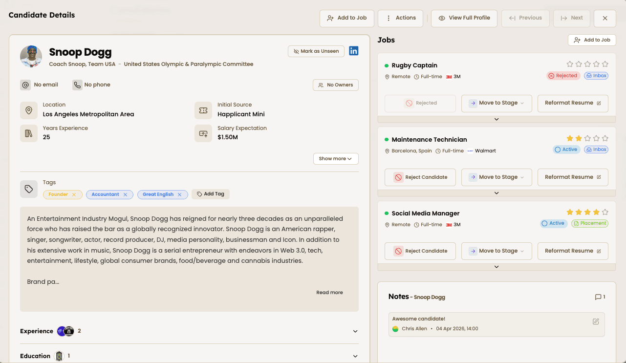 📣 Using Happlicant's LinkedIn Chrome Extension, the Resume Parser, or bulk importing you can easily auto-populate these fields.