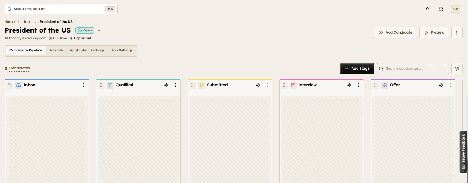 Share your application form or add candidates to kick start the pipeline. If you've published/ shared an application form, you'll start to see candidate cards appear in the your Inbox stage.