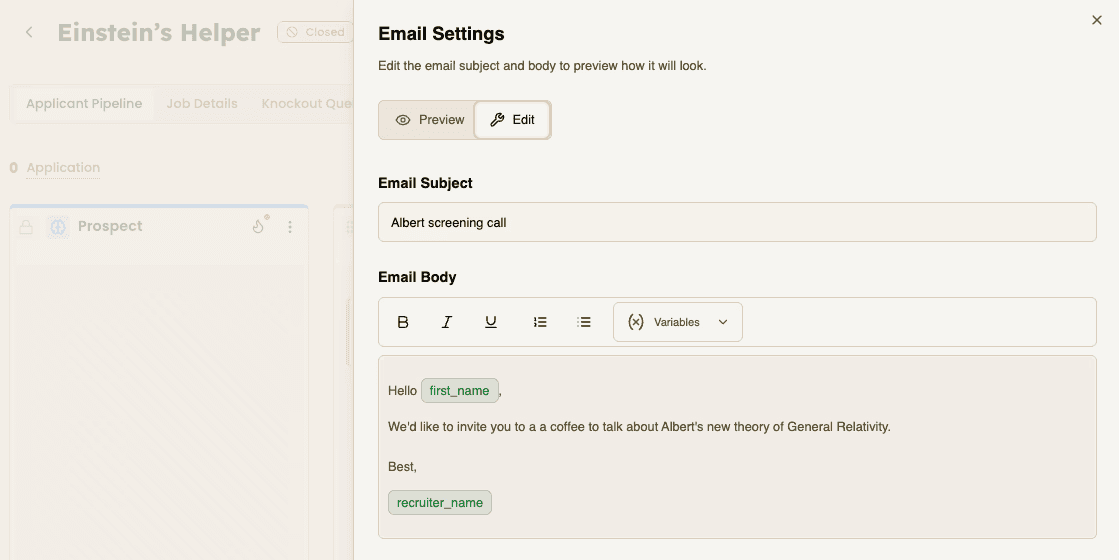 By clicking "Edit Template" you can fully customize them to match your tone. Use the variables to ensure the email is personalized per candidate, job, recruiter, etc.