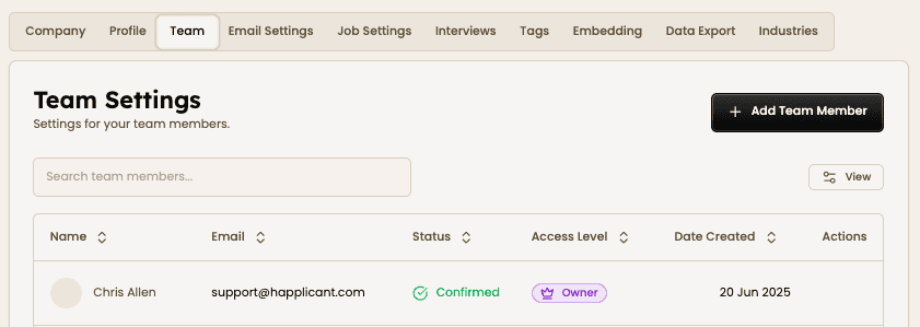 In the Team tab, you can add team members. Simply click "Add Team Member," enter their name and email, and select their access level.