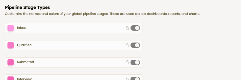 In Job Settings, you can customize the names and colors of your global pipeline stages. Any stages you have in jobs must be assigned to these stage types (or umbrella stages) to enable aggregation of stages for the dashboards, reports, and charts.