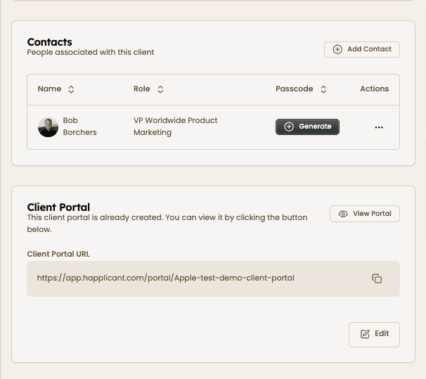 Then you will need to generate a passcode for each of your contacts. As long as the URL and the passcode match, your clients can gain access.