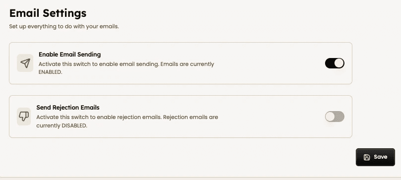 In Email Settings toggle "Enable Email Sending" on to automate email sending when candidates. ⚠️ It's important to toggle this on otherwise emails won't be sent.