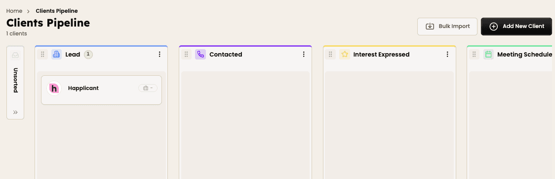 Happlicant offers recruitment agencies the ability to manage leads within a pipeline. You can customize the state names by simply clicking on the titles. You can also delete stages by clicking the three dots and add new stages by scrolling to the end.