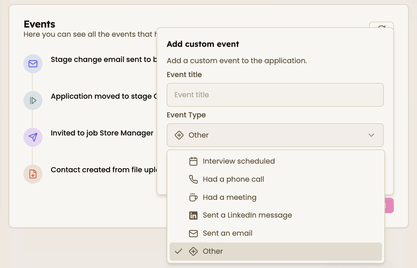 Yes. You can manually log events using Add custom event inside the candidate profile. This is useful for tracking phone calls, offline interviews, meetings, emails sent and any interaction that happens outside Happlicant.