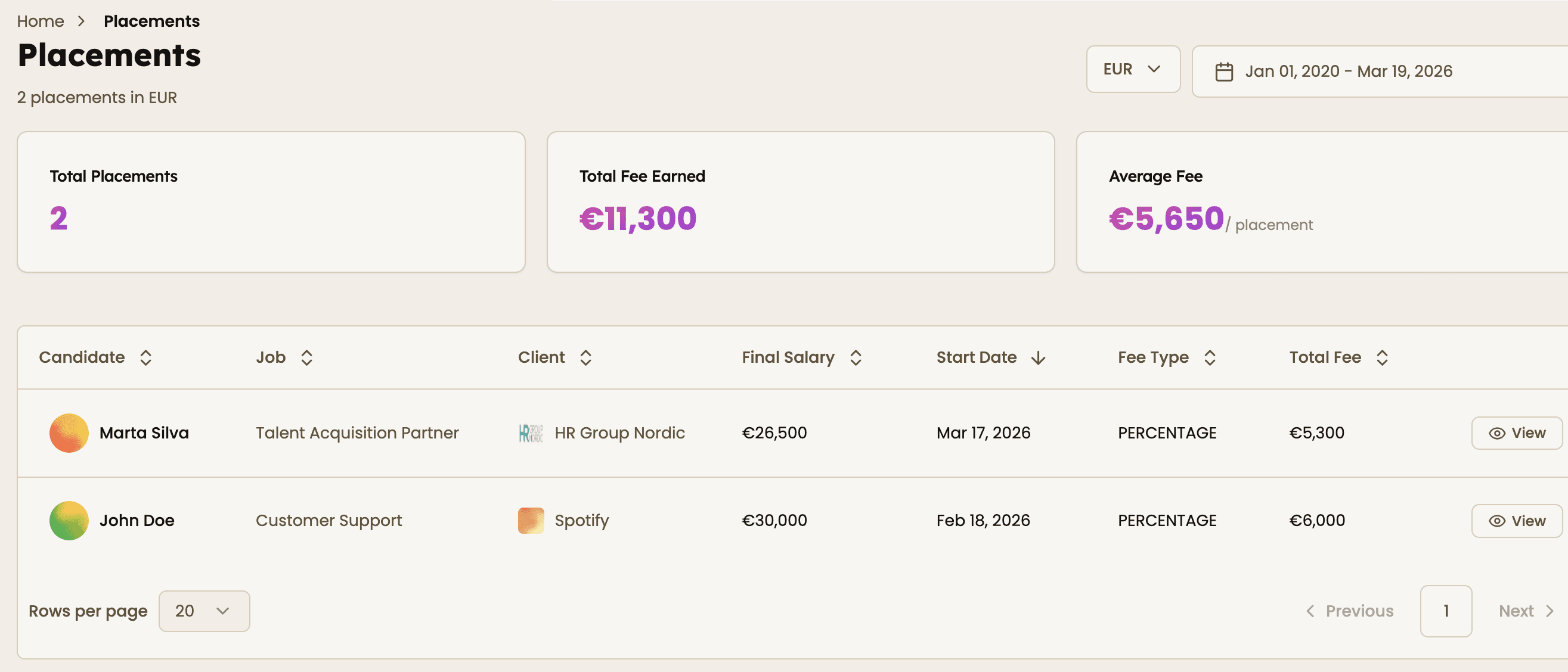 The most reliable way to track recruitment revenue is through an automated system that connects placements, salaries, and fee structures in one place. Happlicant tracks everything in real time, so you can monitor earnings, review placements, and analyze performance without relying on manual spreadsheets.