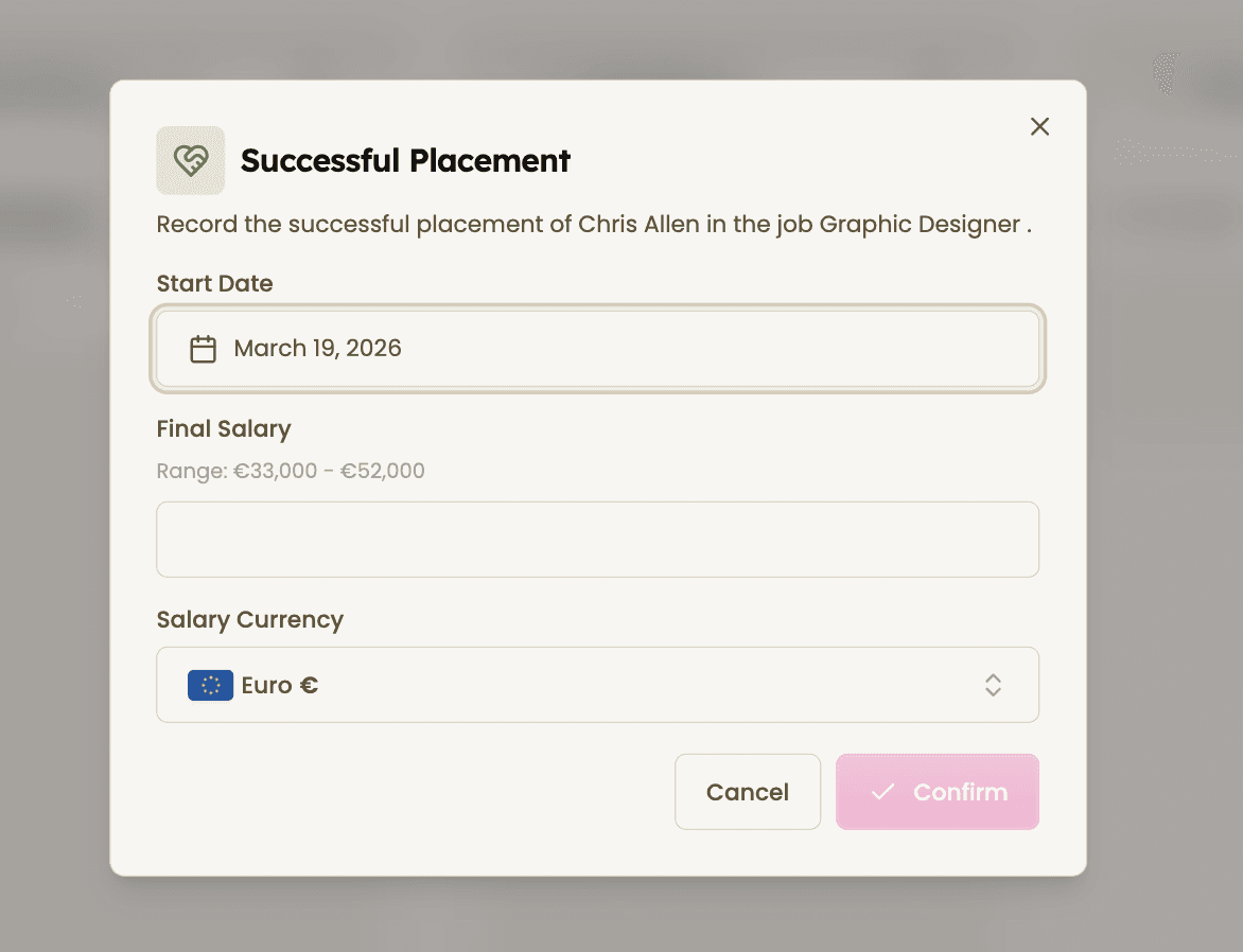 Recruiter commission is typically calculated as a percentage of the candidate’s final salary or as a fixed fee agreed with the client. With Happlicant, this calculation is handled automatically based on the fee structure you set for each job, so you always know the exact revenue for every placement.