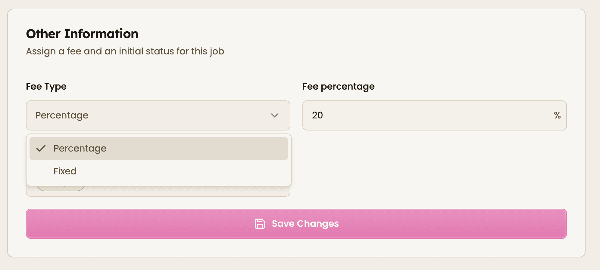 If you choose percentage, enter the fee percentage. If you choose fixed, the system will use that amount for every placement.