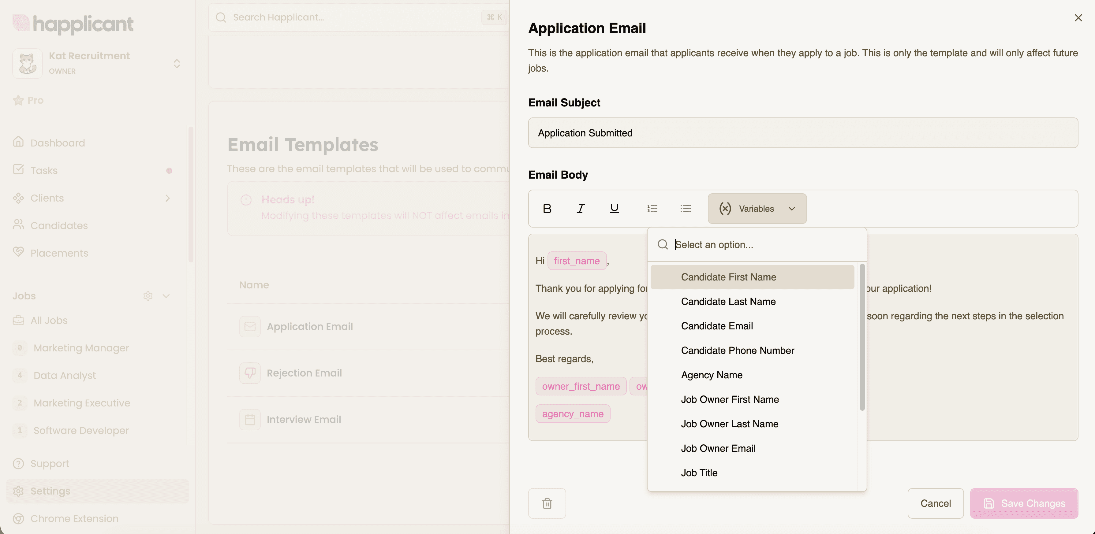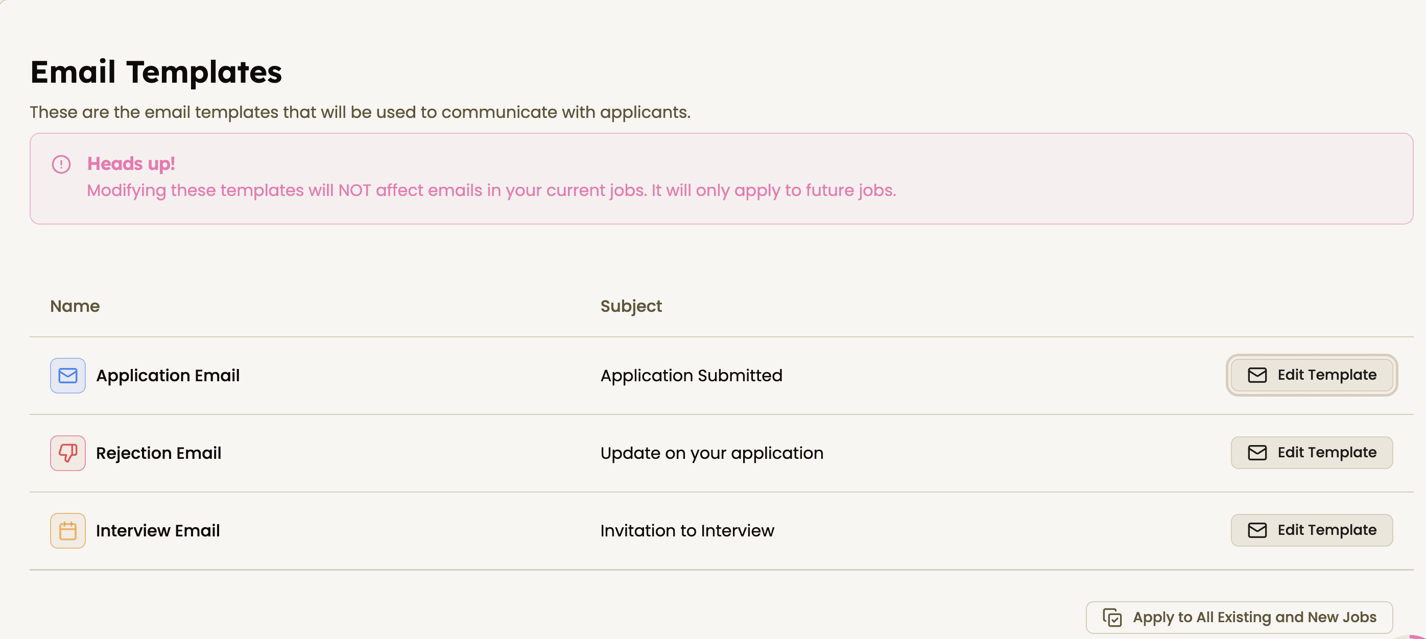 Happlicant’s custom email templates are built specifically as practical tools for independent recruiters and small recruitment agencies. You can choose from ready-made templates such as Application, Interview Scheduling, and Rejection emails, then tailor them to each job, candidate, or client.