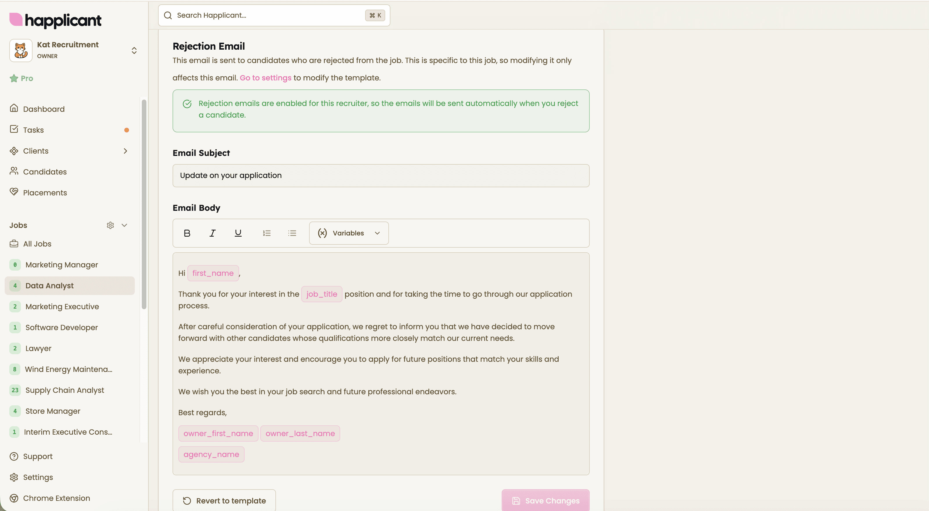 Insert dynamic variables like candidate names, job titles, and interview links to keep every message relevant and personal. Edit templates at any time or override them for a specific role when needed. This flexibility makes it easier to maintain high standards across all your assignments while adapting to each client’s expectations.