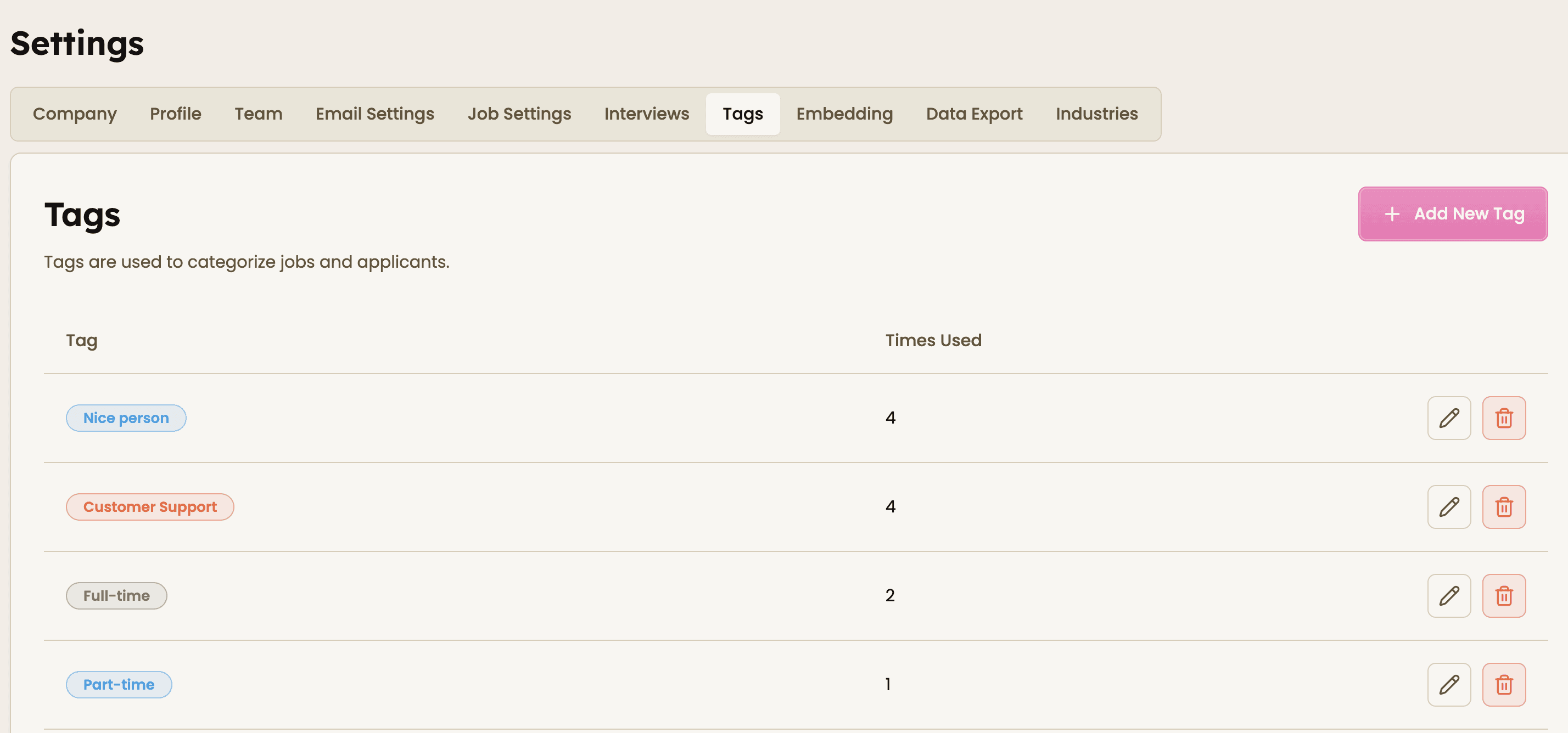 Yes. You can manage your tags anytime in Settings → Tags, where you can rename or remove tags as your hiring workflow evolves. You can also always remove tags from a candidate by clicking the small 'x' on the side
