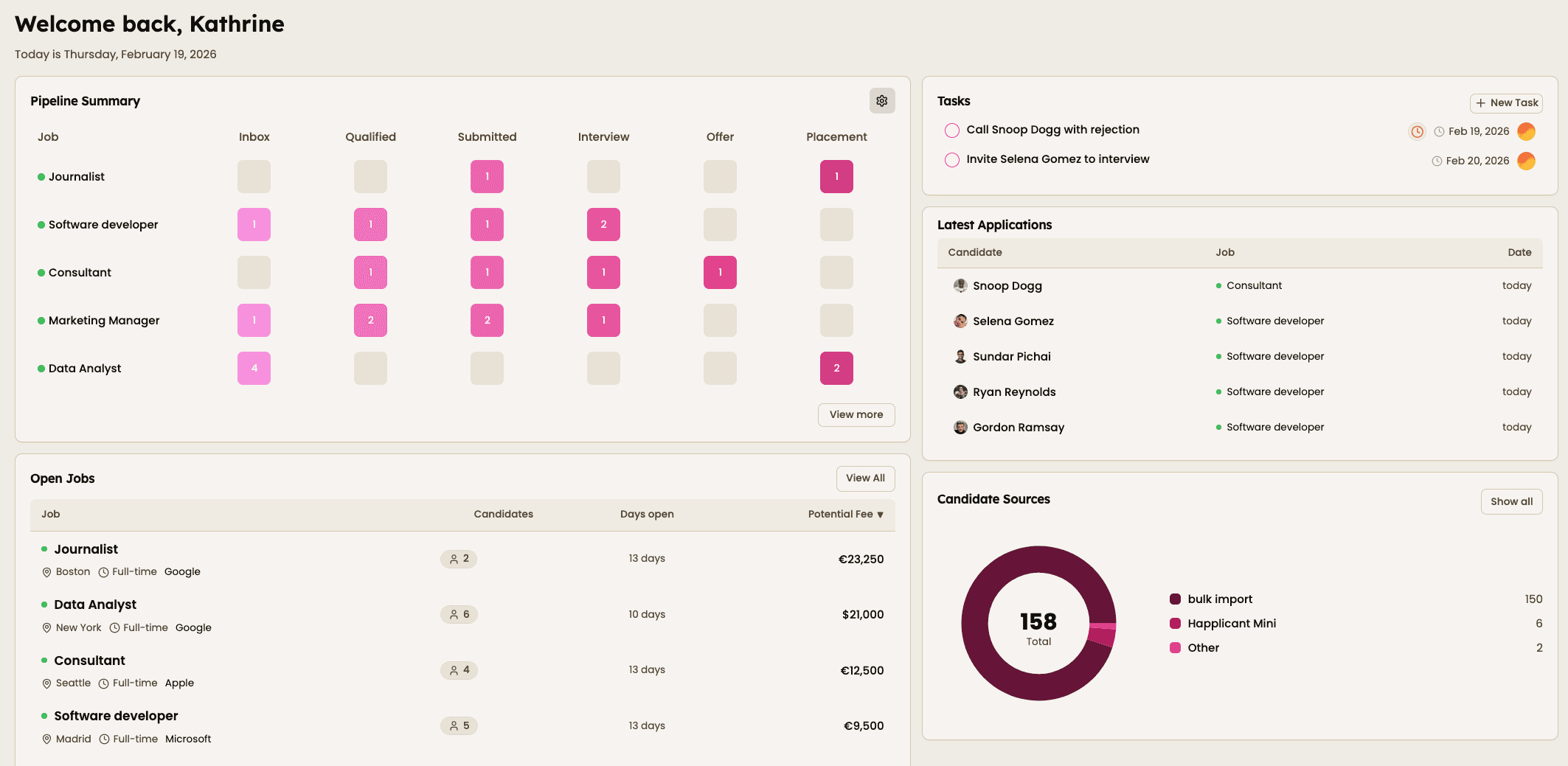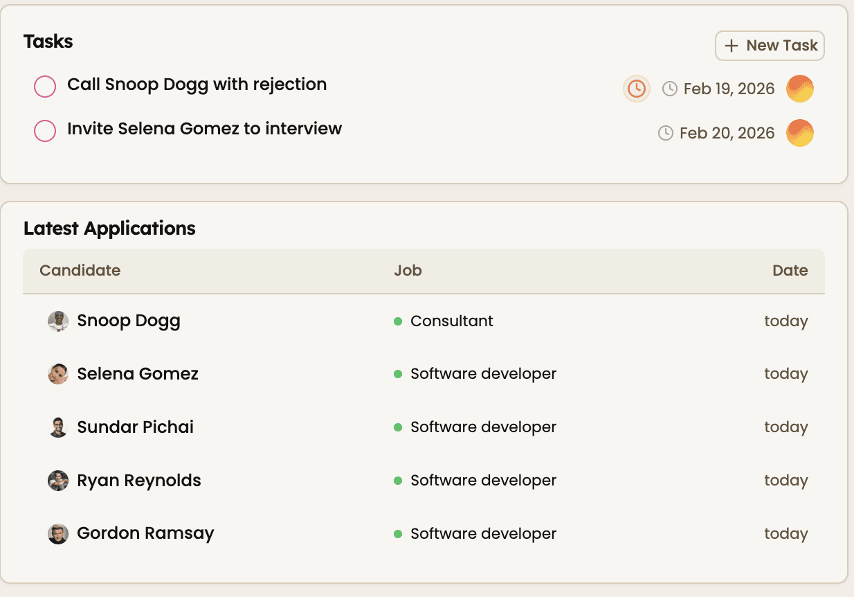 Instead of switching between candidate lists, jobs, and tasks, everything is visible in one structured view. You can monitor your hiring pipeline, track candidate progress, review open roles, and stay on top of daily activity without losing focus.